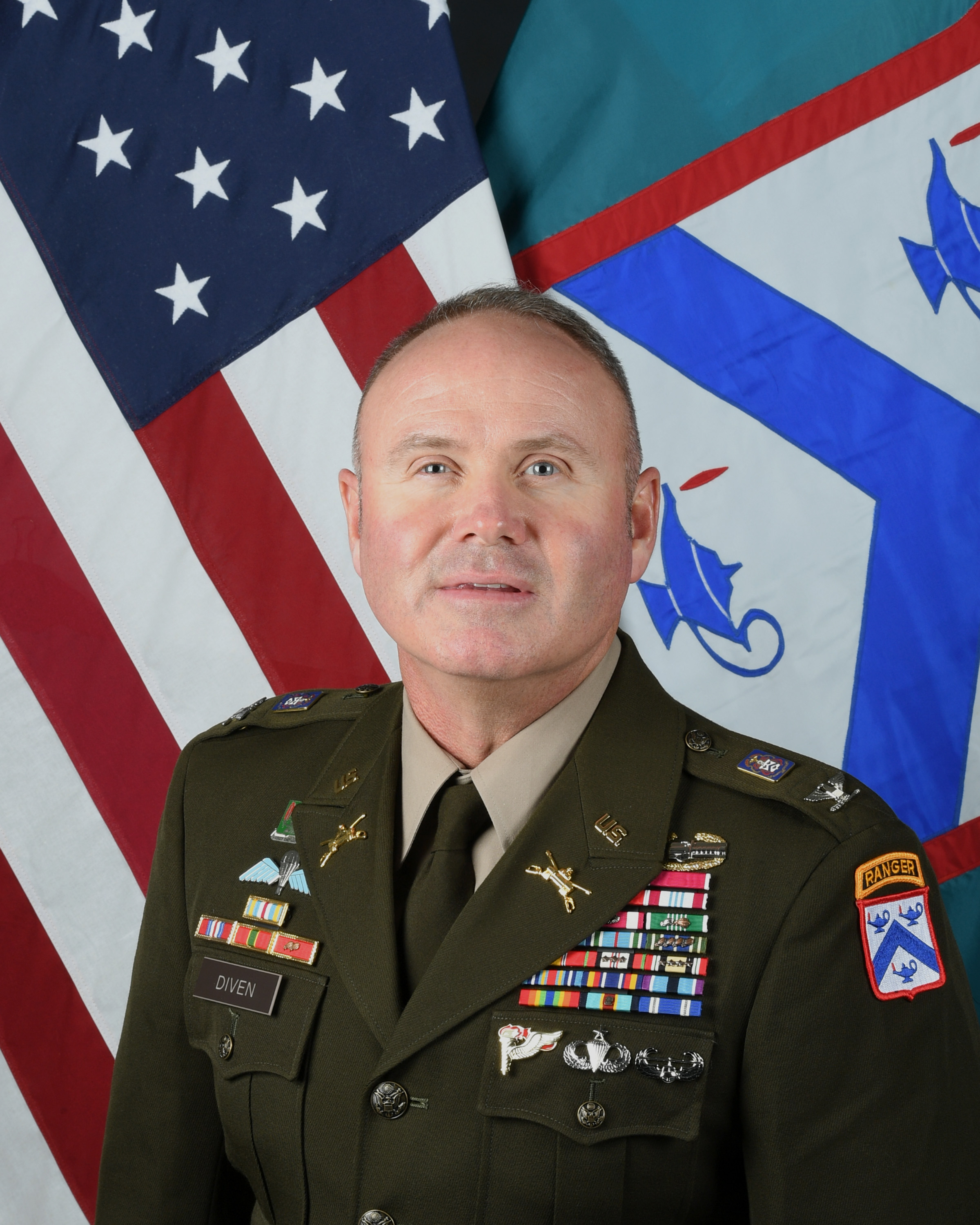 Colonel Diven is from San Diego, CA, and commissioned as an Armor officer through the early commissioning program at the New Mexico Military Institute. He holds degrees from both Texas Tech University and Central Michigan University. His military education includes the Joint Advanced Warfighting School, the U.S. Army Command and General Staff College, the Infantry Captain’s Career Course, and the Armor Officer Basic Course.
