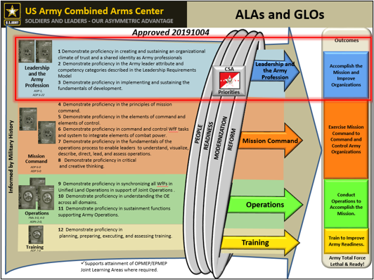 PME Team provides staff management and academic oversight of the Army's Professional Military Education (PME) systems to ensure PME curriculum and approved learning outcomes are properly aligned, progressively rigorous, and sequentially taught in all Army cohorts. Click on the link below for an overview of the Army Learning Areas (ALAs) and General Learning Outcomes (GLOs) with which all common core educational products must align.